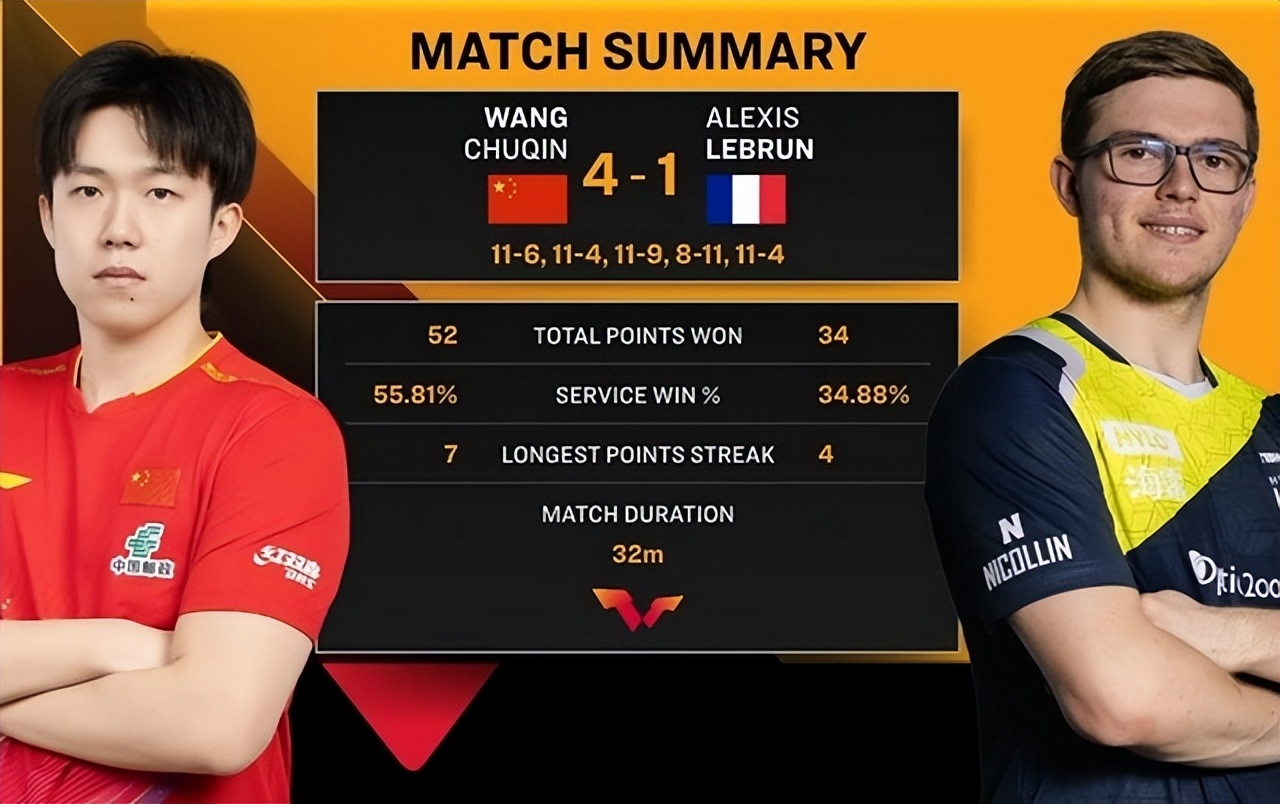 此役,王楚欽一路領先以11-6先下一城,第二局王楚欽又以7-2拉開比分并以11-4輕松再勝。第三局,還是王楚欽一路領先并且率先拿到局點,不過艾利克斯·勒布倫在局末連續追分追到了9-10,王楚欽頂住壓力11-9拿下。第四局,艾利克斯·勒布倫扭轉了被動的局面,以11-8扳回一城。第五局,王楚欽沒有再給艾利克斯·勒布倫機會,11-4輕松拿下,以總局分4-1晉級男單半決賽。