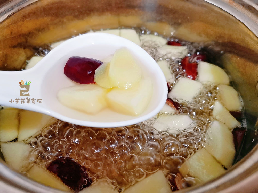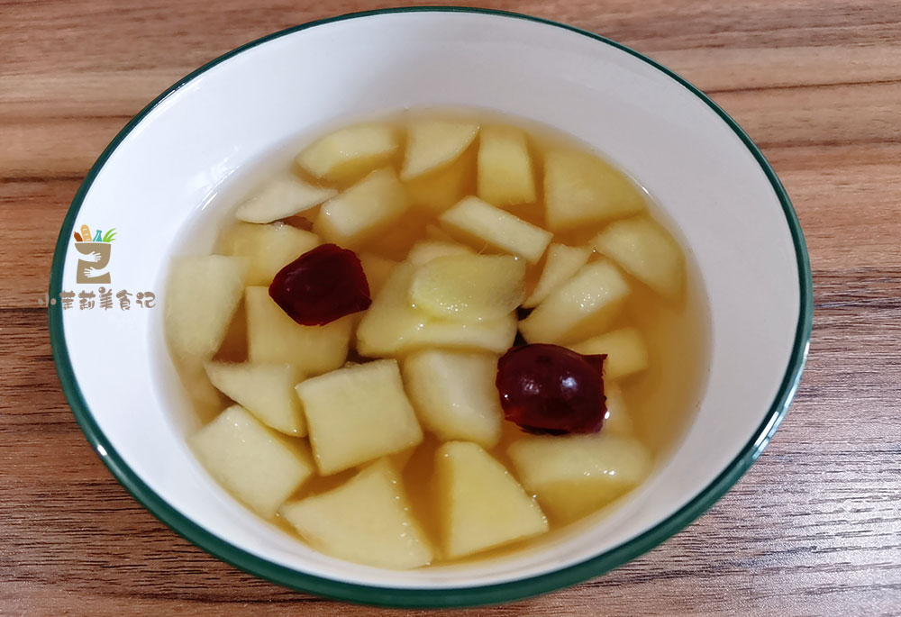 3、先在鍋里添好水,蘋果以及棗放進(jìn)去,煮到沸騰時,調(diào)整至小火,再煮十五分鐘。屆時把姜片放進(jìn)去,將湯汁攪勻,咕嘟七八分鐘即可關(guān)火。