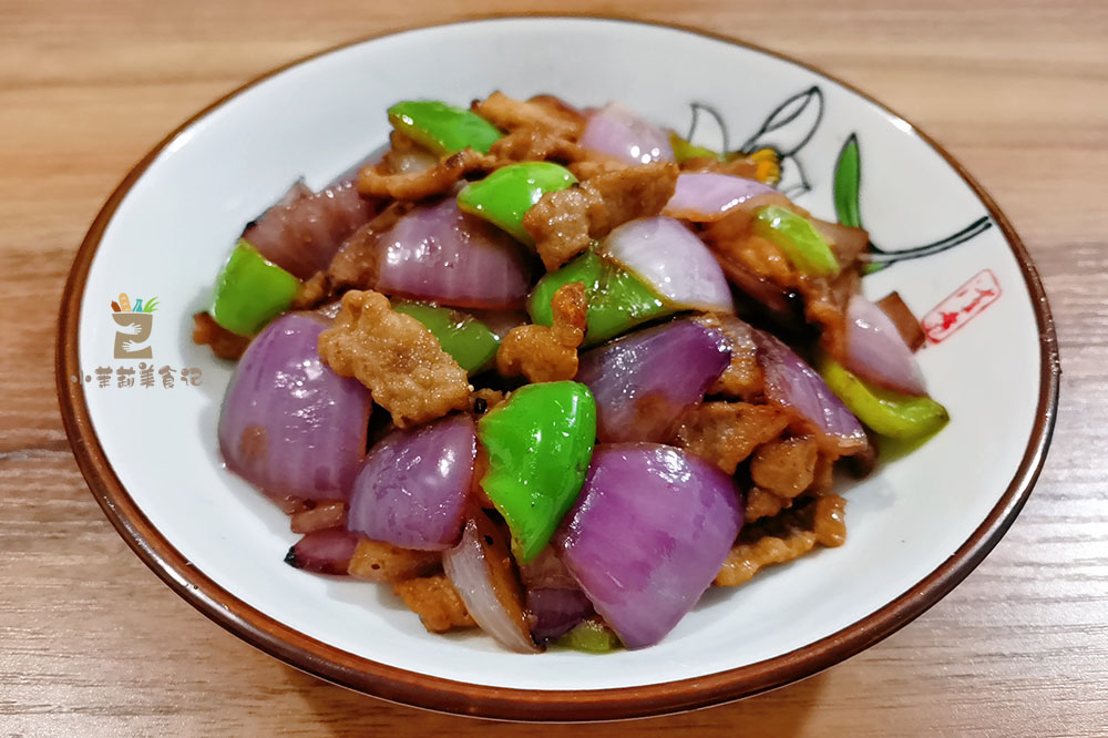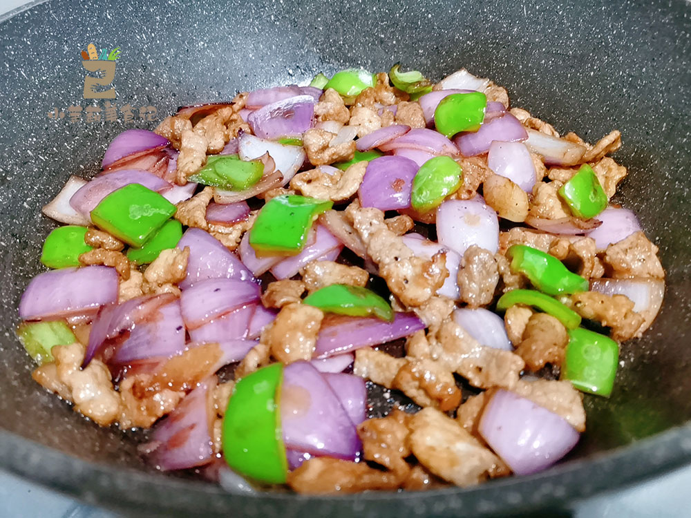 4、直接把洋蔥柿子椒倒在底油里,快速炒一會兒,調(diào)些生抽,蠔油調(diào)整味道,最后把肉片倒回去,加點(diǎn)黑胡椒,炒勻入味后,出鍋裝盤。
