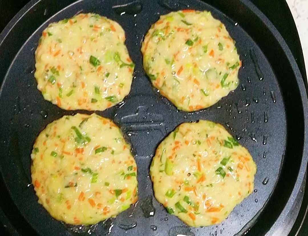4、在電餅鐺里噴一點(diǎn)點(diǎn)油,待熱透后,把山藥混合物分成小份放進(jìn)去,整理得薄一些,兩面一起加熱,直到成型后盛出來就可以。松軟的小餅,噴香美味,胃里很舒服。