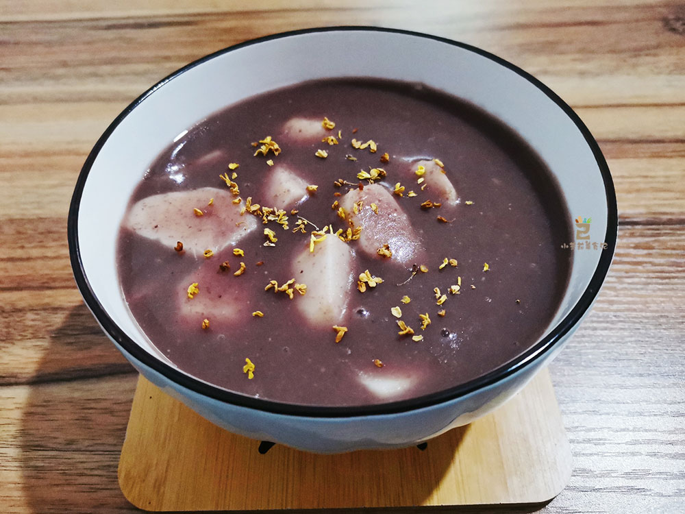 3、紅豆沙倒在湯鍋中,放兩個老冰糖,芋頭倒進(jìn)去,煮兩分鐘,即可關(guān)火,盛到碗里,撒些桂花,一碗甘甜可口的紅豆沙就煮好了,美味又暖身。