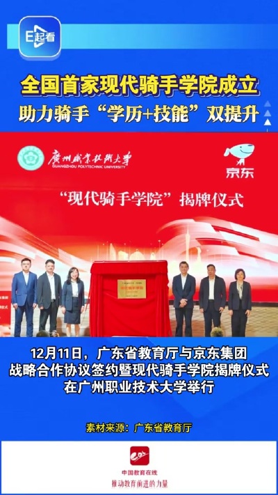 12月11日下午,廣東省教育廳與京東集團簽訂戰略合作協議,全國首家“現代騎手學院”正式揭牌。該學院設在廣州職業技術大學,將依托廣職大的職業教育資源與京東集團的業務場景,為在職騎手和快遞員提供學歷和技能“雙提升”通道。