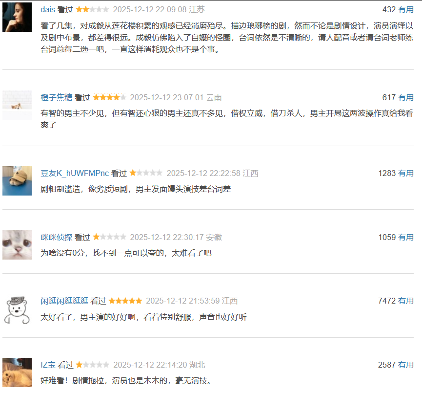 而差評的觀眾則是老生常談的問題,成毅的演技不行,臺詞黏糊沒有進步。浪費了最強配角陣容。