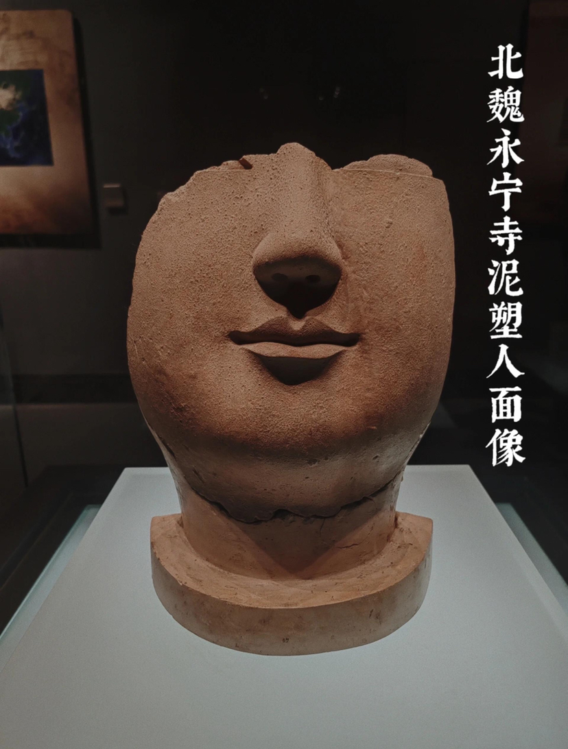 北魏泥塑佛面像:1979年出土于洛陽偃師龍虎灘村北魏永寧寺塔基之中,殘高24.5厘米。佛像面部豐腴,鼻梁挺直,嘴角微微上翹,被譽為"東方的蒙娜麗莎",是南北朝時期中國佛教造像的經典之作。