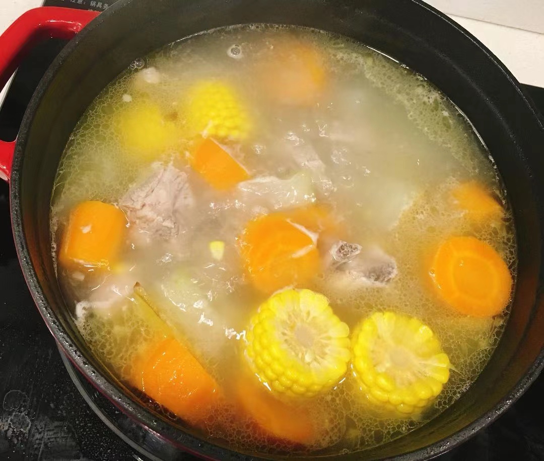 1、黑皮冬瓜一塊,先將外層的硬皮切掉,沖洗過(guò)后,切成大塊。再搭配玉米,胡蘿卜,也都分別處理好。