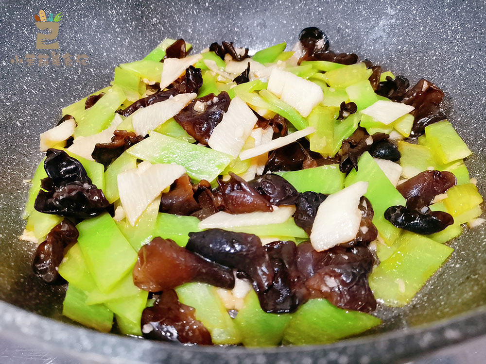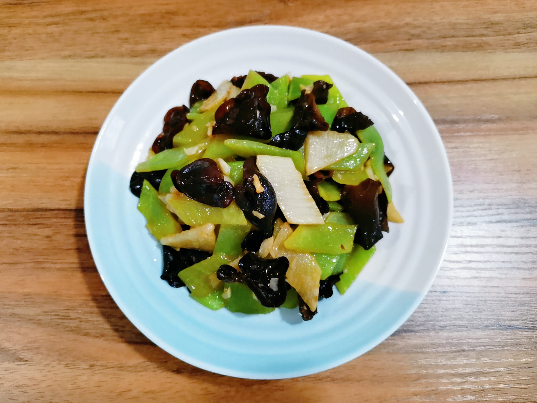 4、先燒一些熱水,把木耳倒進(jìn)去煮透后撈出。起鍋放油,一點(diǎn)蔥花蒜蓉放進(jìn)去扒拉香,所有的菜都下鍋一起炒,兩三分鐘后徹底熟透,調(diào)些生抽,鹽,簡(jiǎn)單調(diào)個(gè)味即可裝盤。
