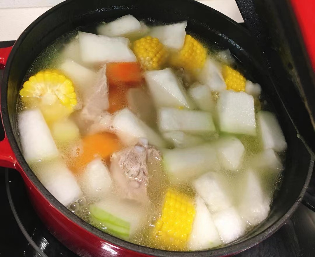 3、重新起鍋,直接添夠水,將排骨先倒進(jìn)去,丟些蔥姜,先清水燉一個(gè)鐘頭。屆時(shí)將冬瓜及其他的食材倒里邊,再用小火燉一個(gè)鐘頭,軟爛熟透后,補(bǔ)些鹽即可。