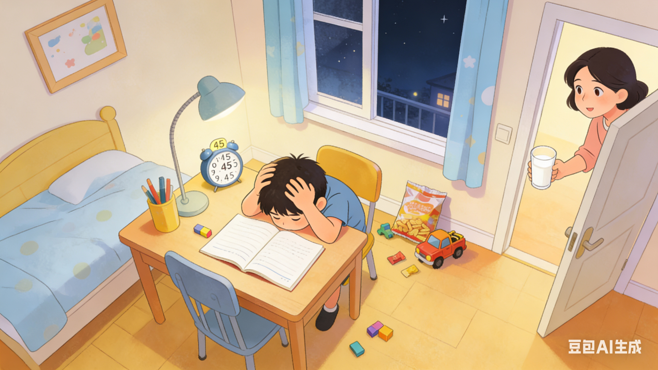 第二個(gè)關(guān)鍵“求救信號(hào)”:專注力被破壞,無法進(jìn)入高效學(xué)習(xí)狀態(tài)。五年級(jí)的萌萌寫作業(yè)時(shí),每隔十分鐘就會(huì)起身喝水、找文具,媽媽稍不注意她就偷偷翻看漫畫書。家長只看到她“不專心”,卻沒意識(shí)到是家庭學(xué)習(xí)環(huán)境充滿干擾:媽媽頻繁進(jìn)出送水果,爸爸在客廳開著電視看球賽,手機(jī)消息提示音不斷響起。孩子的專注力本就脆弱,長期被外界干擾切割,會(huì)形成“專注—被打斷—分心”的惡性循環(huán)。更有家長在孩子寫作業(yè)時(shí)全程“監(jiān)工”,一發(fā)現(xiàn)錯(cuò)誤就立刻指正,這種高頻干預(yù)會(huì)讓孩子陷入恐懼,只能通過磨蹭來逃避批評(píng)。