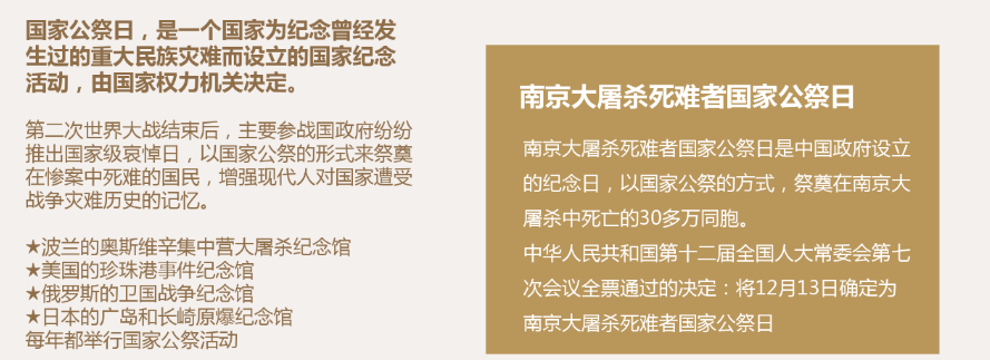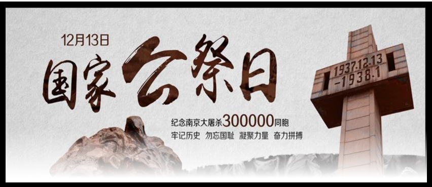 我國決定將12月13日設立為南京大屠殺死難者國家公祭日,每年12月13日國家舉行公祭活動。國家公祭,既是對自己死難同胞靈魂的安撫,也是對帝國主義犯罪者的警示。要取得和平與安寧的幸福生活,就絕不能忘記歷史、忘卻苦難。