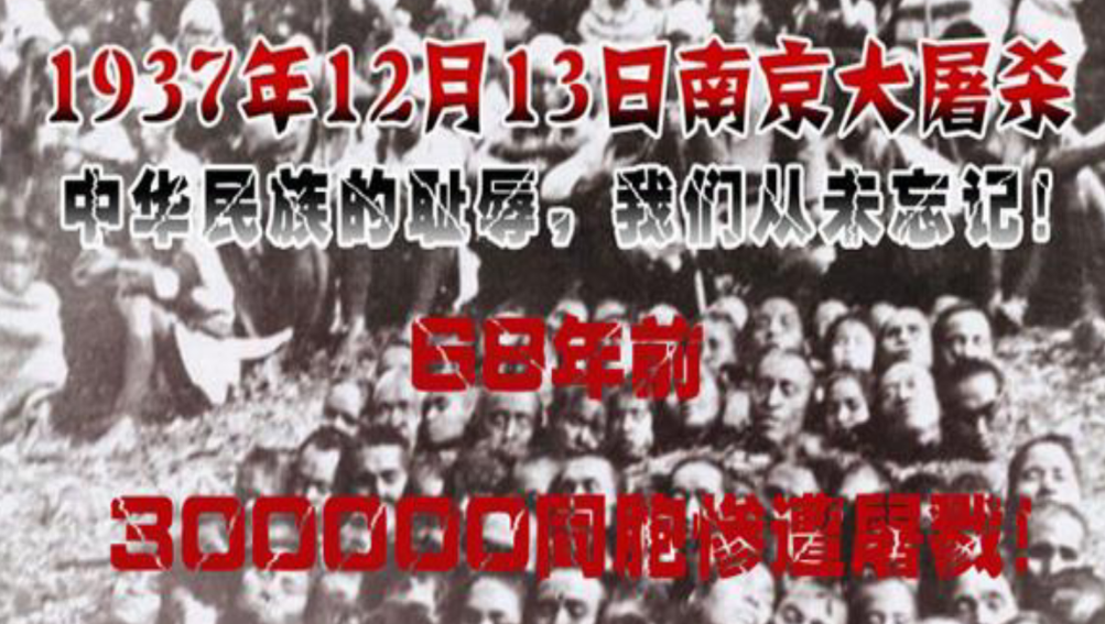 1937年12月13日,侵華日軍在中國南京開始對我同胞實施長達40多天慘絕人寰的大屠殺,制造了震驚中外的南京大屠殺慘案,30多萬人慘遭殺戮。