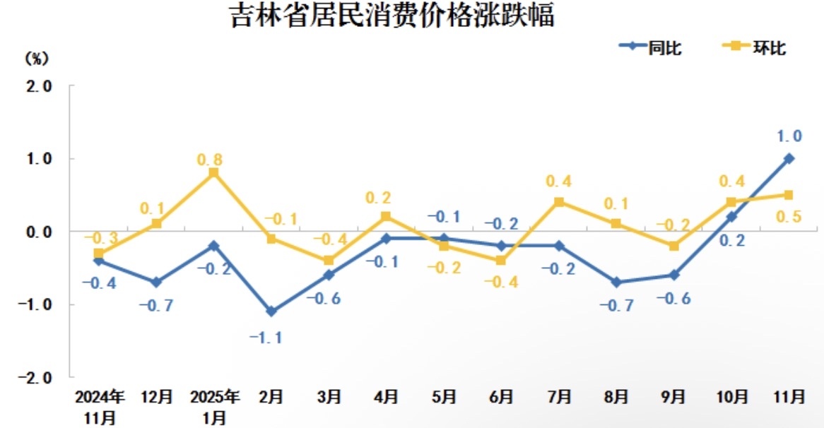 11月份,吉林省居民消費價格環比上漲0.5%。其中,食品價格上漲2.8%,非食品價格持平;消費品價格上漲0.9%,服務價格下降0.1%。