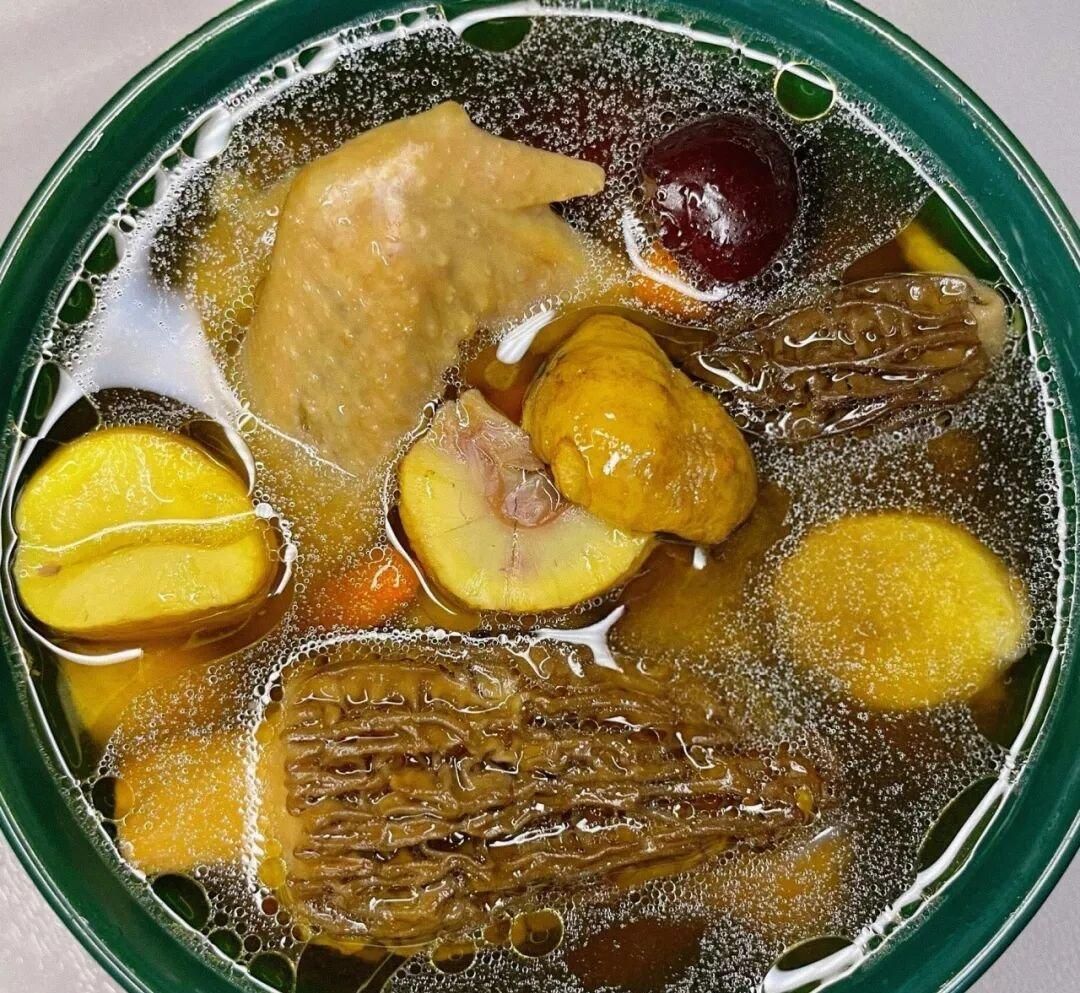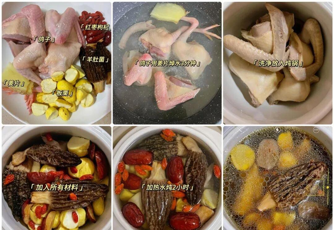準備一只鴿子,十顆去殼板栗,五到八朵羊肚菌,五顆紅棗,一小把枸杞,還有三片生姜。