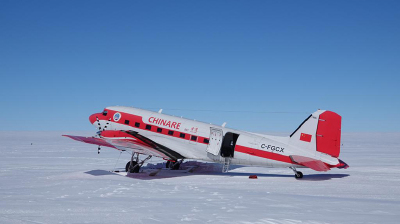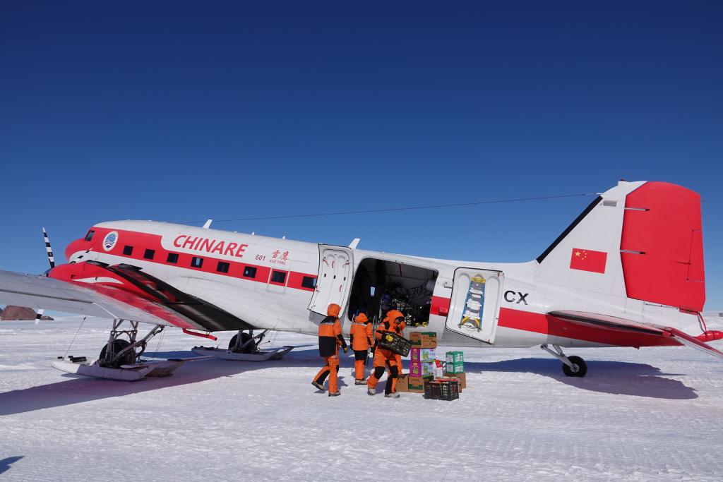 2015年11月30日,一架紅白相間的固定翼飛機降落在南極中山站附近的冰蓋機場,尾翼上的五星紅旗格外醒目。