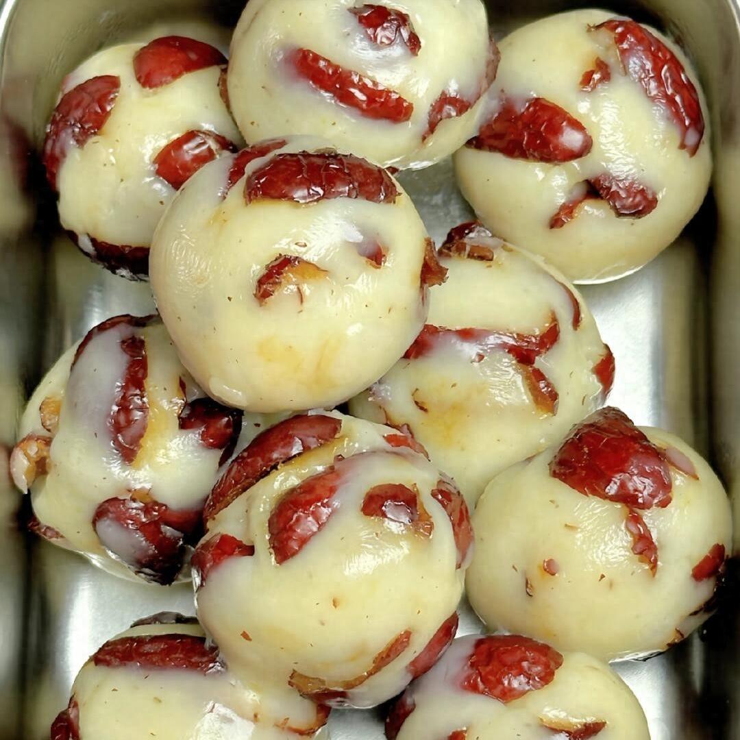 3、將山藥泥放至溫?zé)幔尤朊娣邸⑴疵追?、紅棗碎和冰糖粉,用手揉成光滑的面團(tuán),不粘手、不松散即可。