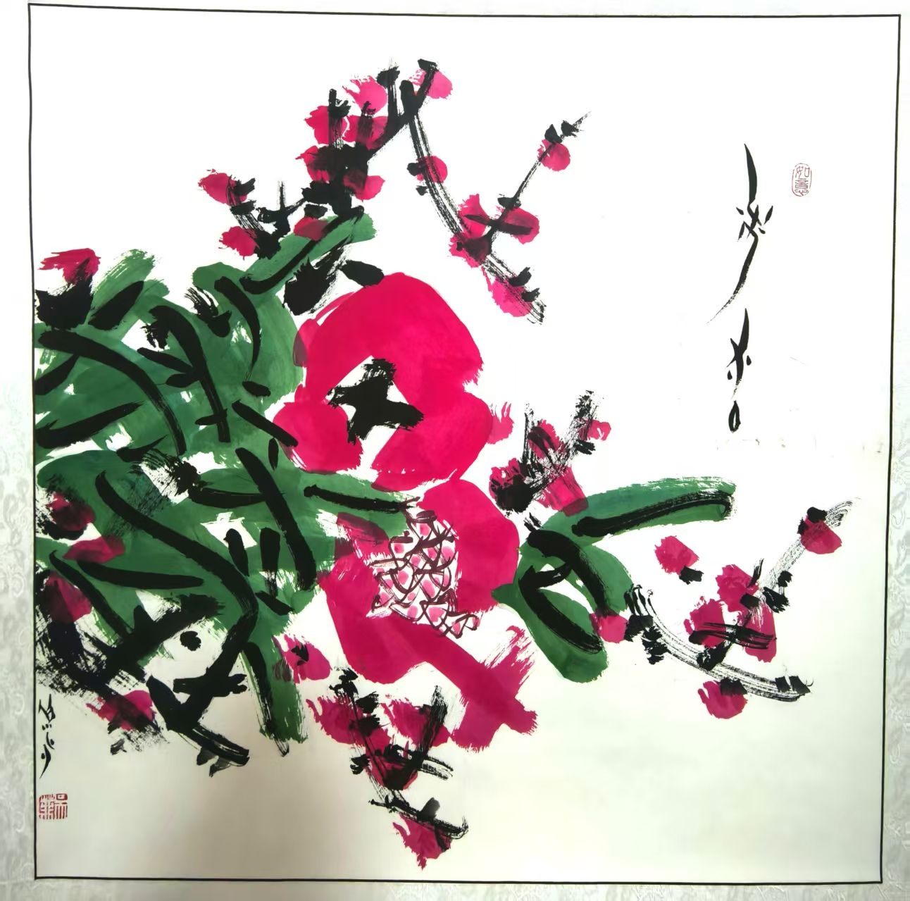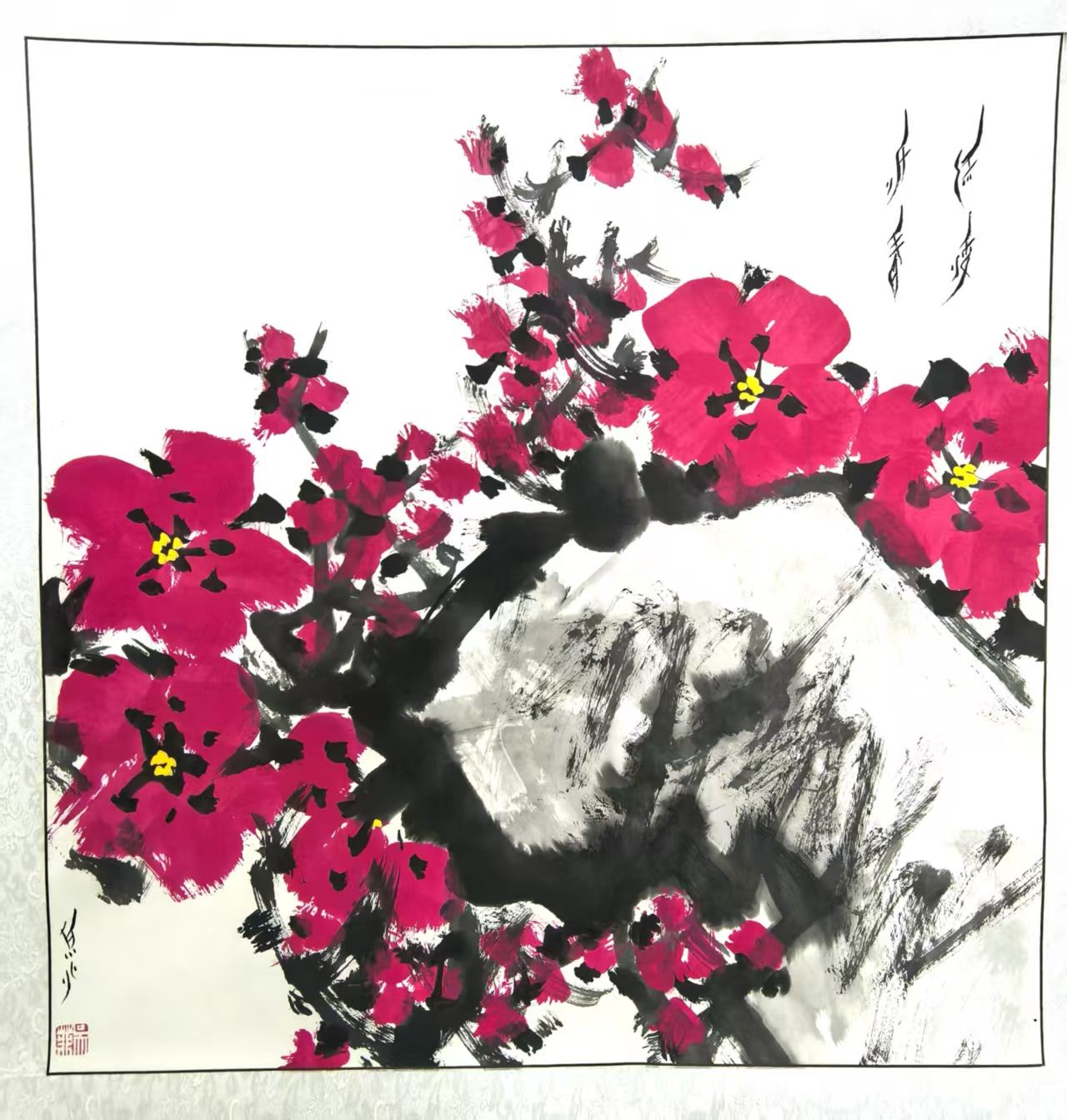 吳菲女士自幼酷愛書畫,擅長大寫意花鳥畫,作品以“稚拙樸實、蒼勁自然、施色艷麗”的鮮明風格著稱,現任南陽慈善書畫院副院長、南陽市美術家協會辦公室副主任、南陽市臥龍區文聯兼職副秘書長、南陽市臥龍區民間文藝家協會副主席、南陽市臥龍區文藝志愿者協會副主席、河南省美術家協會會員、河南省書法家協會會員等職,其作品多次入選全國及省級書畫展覽并獲廣泛贊譽。此次獲獎的《紅梅報春》以蒼勁筆墨繪就寒梅綻放之態,紅梅灼灼的祥瑞意象躍然紙上,筆墨間盡顯傲骨與生機;《碩果》則以飽滿色彩描繪豐收盛景,果實飽滿欲滴,傳遞出對美好生活的贊頌與期許。兩幅作品巧妙融入女書元素,將傳統花鳥畫的意境美與女書的文字完美融合,既彰顯了非遺文化的獨特魅力,又展現了當代女性藝術家的創作才情,贏得組委會與觀展者的一致好評。