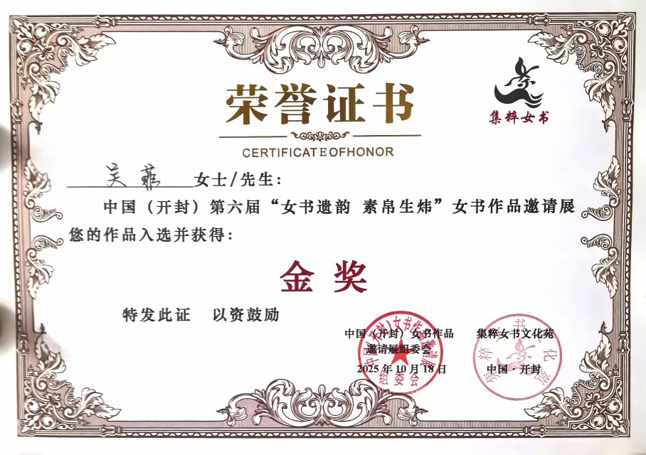 2025年10月18日,中國(開封)第六屆“女書遺韻 素帛生煒”女書作品邀請展在八朝古都開封圓滿落幕。南陽知名書畫家吳菲女士憑借《紅梅報春》《碩果》兩幅精心之作脫穎而出,從海內外300余件參展作品中榮獲金獎,以丹青之力傳承非遺文脈,為南陽文化藝術界再添殊榮。