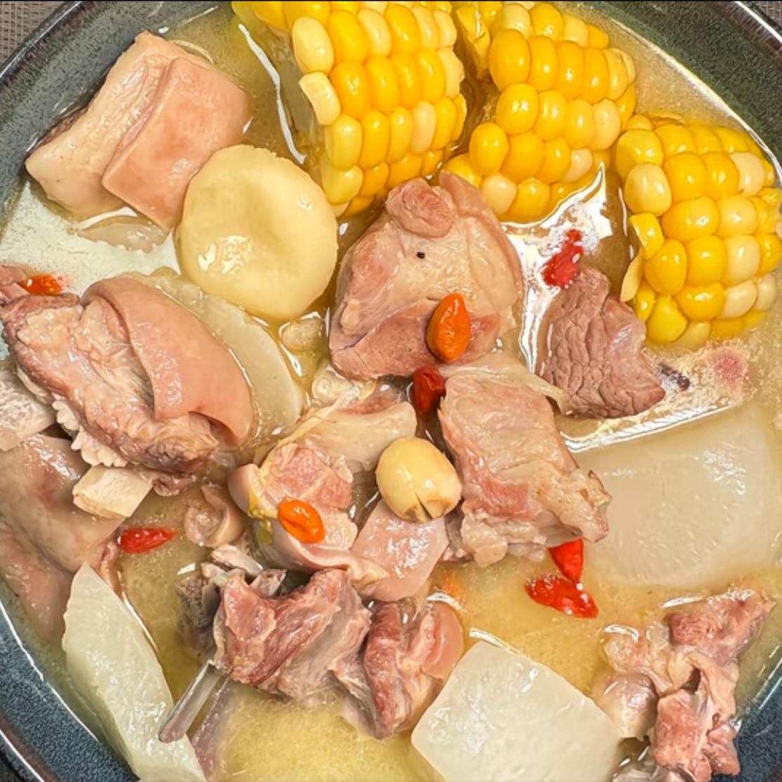 食材: 羊肉、白蘿卜、馬蹄、玉米、蓮子、枸杞、陳皮、姜片。