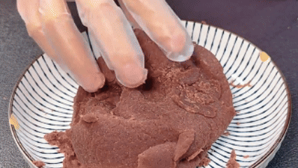 盛出晾涼后戴上手套,取一小團紅豆餡(約30克),捏實搓圓成小球狀,像雞蛋黃大小。全部搓好后放一旁備用。