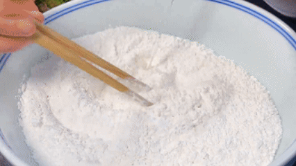 在紅豆煮著的時候,我們來和面。準備一個大碗,倒入糯米粉,再分次加入熱開水,邊倒邊用筷子攪拌,直到攪成面絮狀。放一旁晾至不燙手時,加入酵母和少量白糖促進發酵,再加入普通面粉,繼續攪拌均勻,讓兩種粉充分融合。如果面絮太干,可以適當加點牛奶或清水。