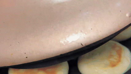 每烙一分鐘翻一次面,反復操作,一共約烙5分鐘,直到兩面金黃微鼓,用鏟子輕按能快速回彈,說明糯米餅已熟。