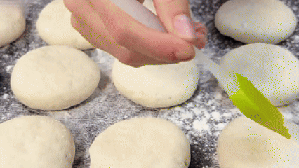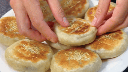 在每個糯米餅表面刷一層清水,再撒上白芝麻,用手按壓使芝麻粘得更牢,這樣烙出來香氣更濃。