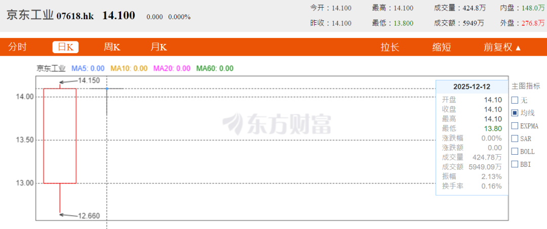 12月12日更微妙,京東工業開盤下探后繼續收平,股價在14.10港元穩如老狗。但這一天成交額急劇縮水,跌至5949萬港元。