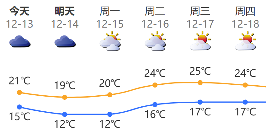 12月13日,陰天,有小雨;氣溫15℃—21℃;北風3級—4級,沿海、高地和海區最大陣風8級;相對濕度55%—95%。