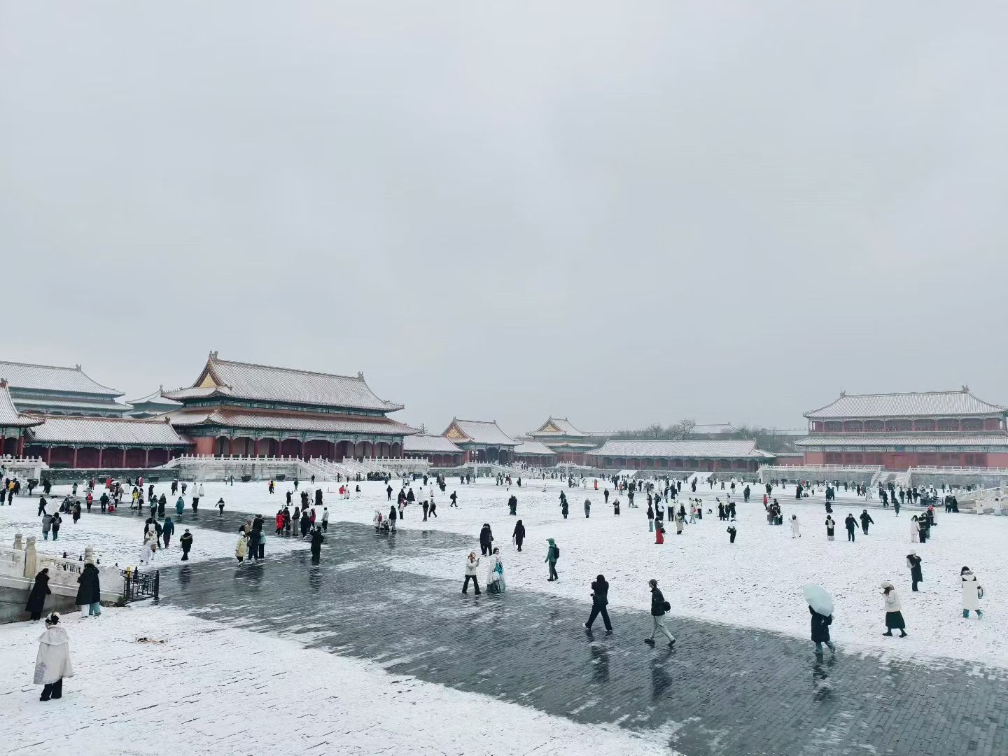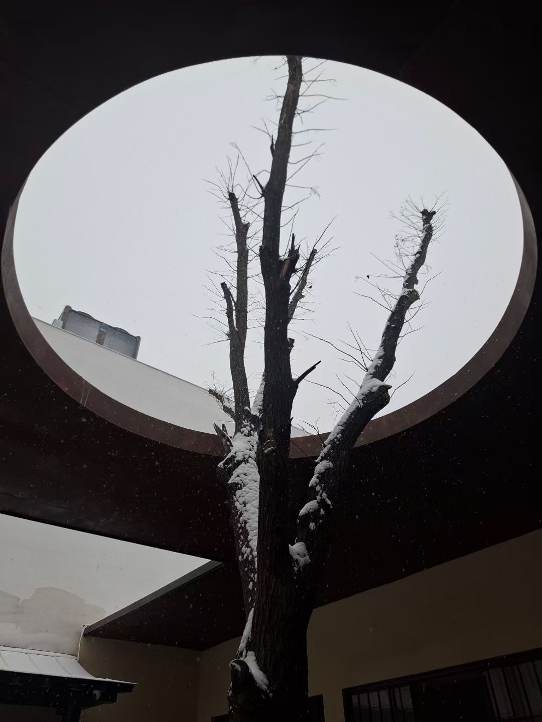那方圓窗里的樹最是妙——枯椏被雪裹成銀簪,枝梢戳著灰白的天,像從畫框里伸出來的冬意,連墻檐的雪沫子都落得輕,怕驚了這幀靜。故宮的雪場是另番熱鬧,紅墻金瓦裹了層白絨,游人踩著碎雪咯吱響,連宮道的冰轍都漾著笑,是古意里浸出來的煙火氣。