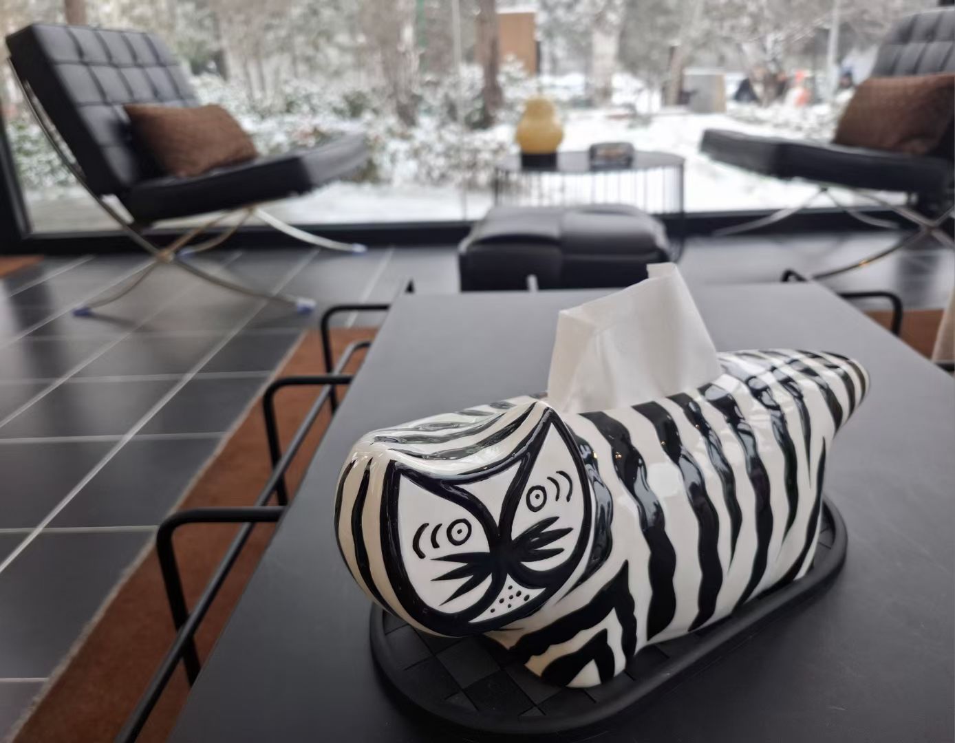 室內的斑馬紋貓紙巾盒正憨,黑白紋路沾著暖光,窗外雪落得急,倒襯得這軟乎乎的可愛更熨帖。最動人心的是那片殘葉——枯褐的脈絡裹著霜,雪堆成小丘窩在葉心,像冬給秋留的最后顆糖;連常春藤的綠都被雪壓成了碎玉,每片葉都捧著團白,是冷里藏的嫩。
