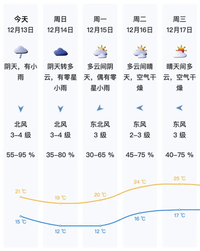 【天氣情況】受冷空氣影響,13日陰天有小雨,氣溫下降,北風(fēng)加大,氣溫15-21℃,沿海、高地和海區(qū)最大陣風(fēng)8級左右,體感轉(zhuǎn)冷;14日零星小雨轉(zhuǎn)多云,午后風(fēng)力減弱;15日多云間陰天,偶有零星小雨;14-15日早晨最低氣溫降至12℃左右。