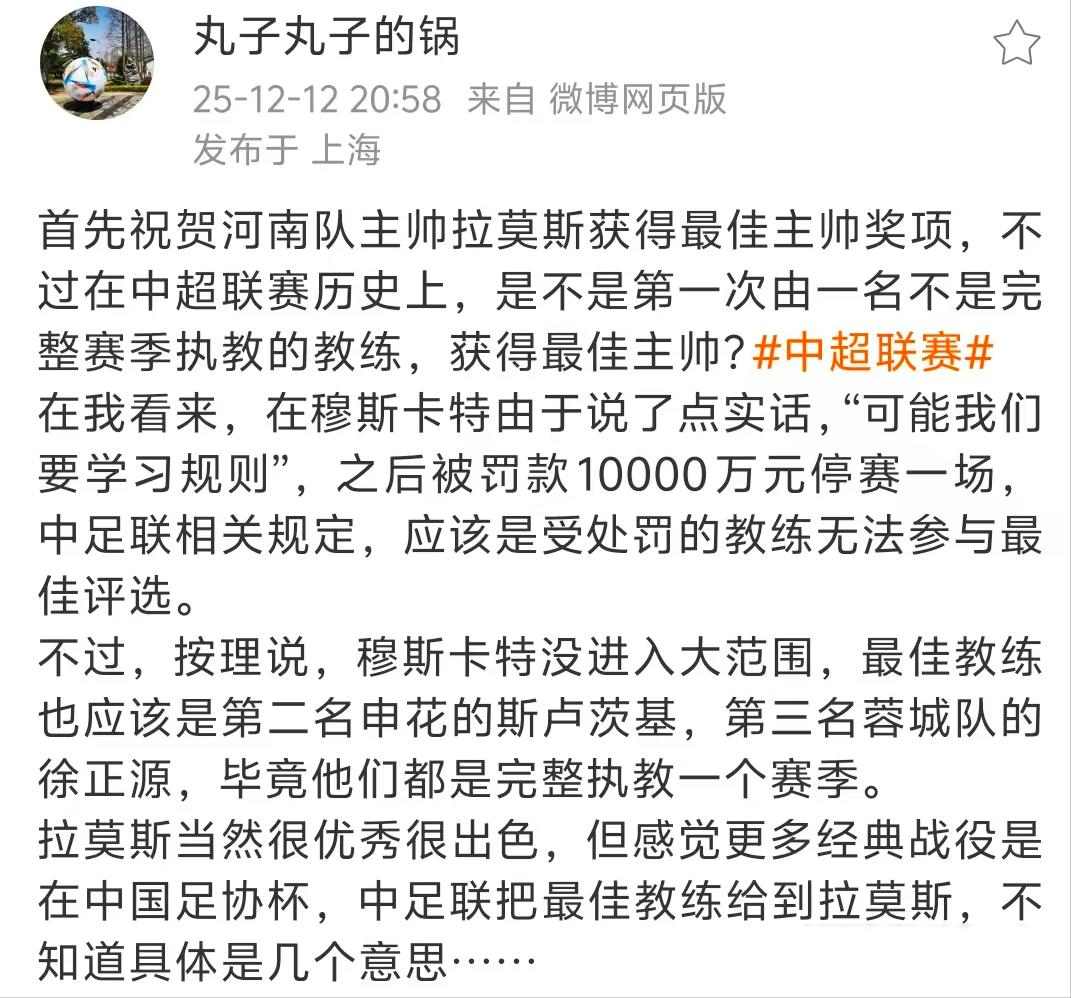 其他教練也覺得不公平,申花隊斯盧茨基和成都隊徐正源都完整帶完賽季,隊伍排名第二第三,成績不錯,結果一個沒被提名,一個沒獲獎,河南隊在足協杯拿到亞軍,這個成績跟教練有關系,如果有關,那這個獎項應該叫“綜合貢獻獎”,不該叫“中超最佳教練”,名字和內容不一致,難怪大家有疑問。