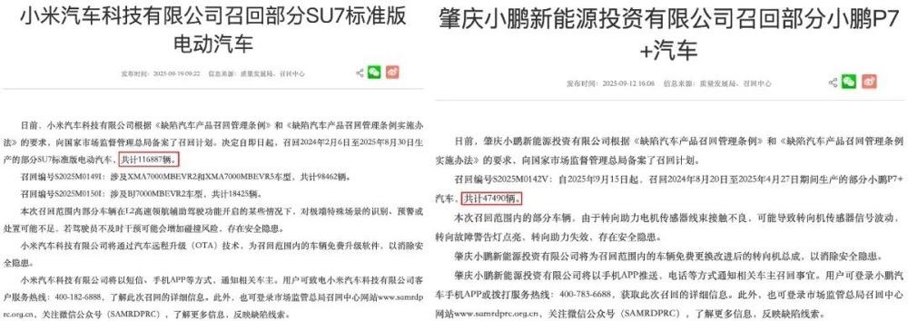而除了比亞迪以外,小鵬汽車因轉向助力電機傳感器線束接觸不良,召回47490輛小鵬P7+,而且另外一家小字輩的小米汽車,因輔助駕駛存在安全隱患,召回116887輛小米SU7標準版。