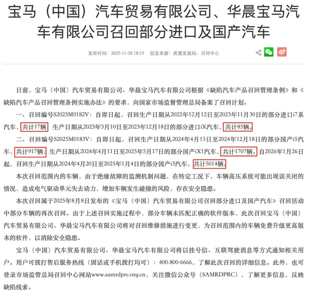 說完了國產新能源,合資的當然也有,比如寶馬召回的i5、iX3、i3三款車型,合計7638輛,不過寶馬新能源的銷量基數太小,基本上是寶馬新能源是全部涉及到了。