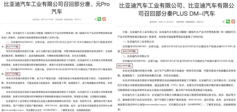 比亞迪11月份就售出了48萬輛,在銷量暴漲的同時,質量卻沒有把好關,除了比亞迪秦PLUS DM-i的問題以外,10月至11月短短兩個月內,比亞迪因“動力電池密封墊安裝不到位”、“動力電池包一致性存在問題”等原因,連續發起多次召回,累計涉及車輛超過20萬輛。