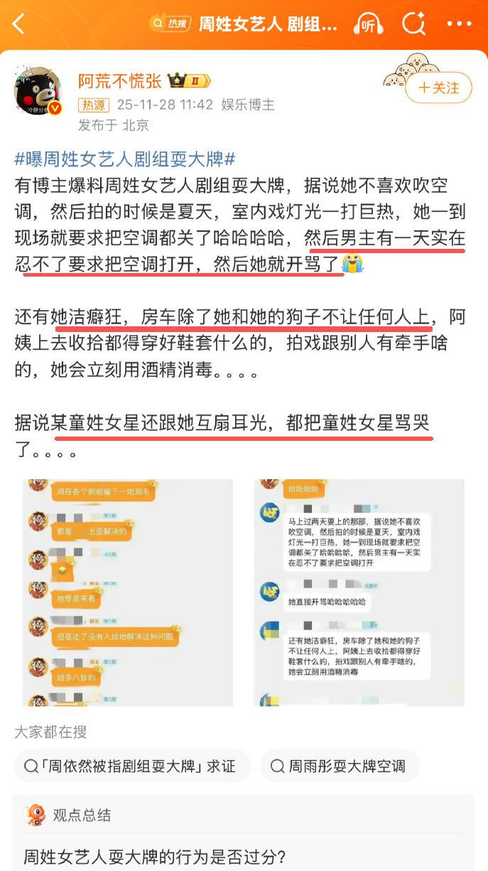 起因是有網友發帖,稱周姓女藝人不喜歡吹空調。
