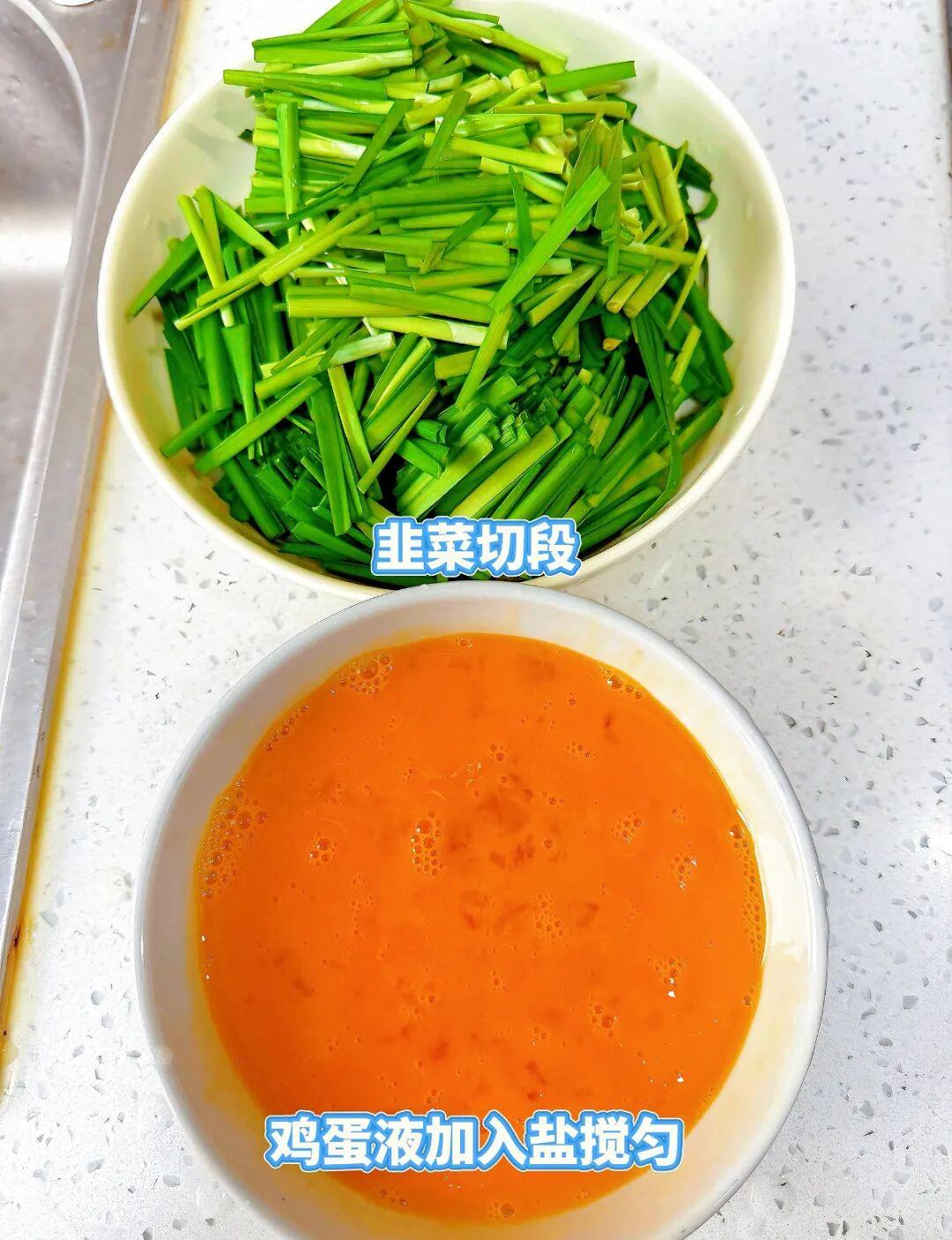 1韭菜擇去老葉和根部,用清水沖洗干凈,切成段。