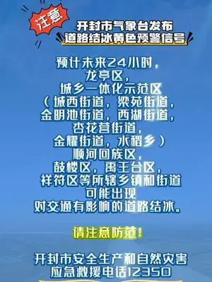 鄭州市氣象臺2025年12月13日08時(shí)45分繼續(xù)發(fā)布道路結(jié)冰黃色預(yù)警信號:受積雪和低溫影響,預(yù)計(jì)未來24小時(shí)內(nèi),鄭州市主城區(qū)、航空港區(qū)、上街區(qū)所轄鄉(xiāng)鎮(zhèn)及街道路表溫度低于0℃,將出現(xiàn)對交通有較大影響的道路結(jié)冰,請注意防范。