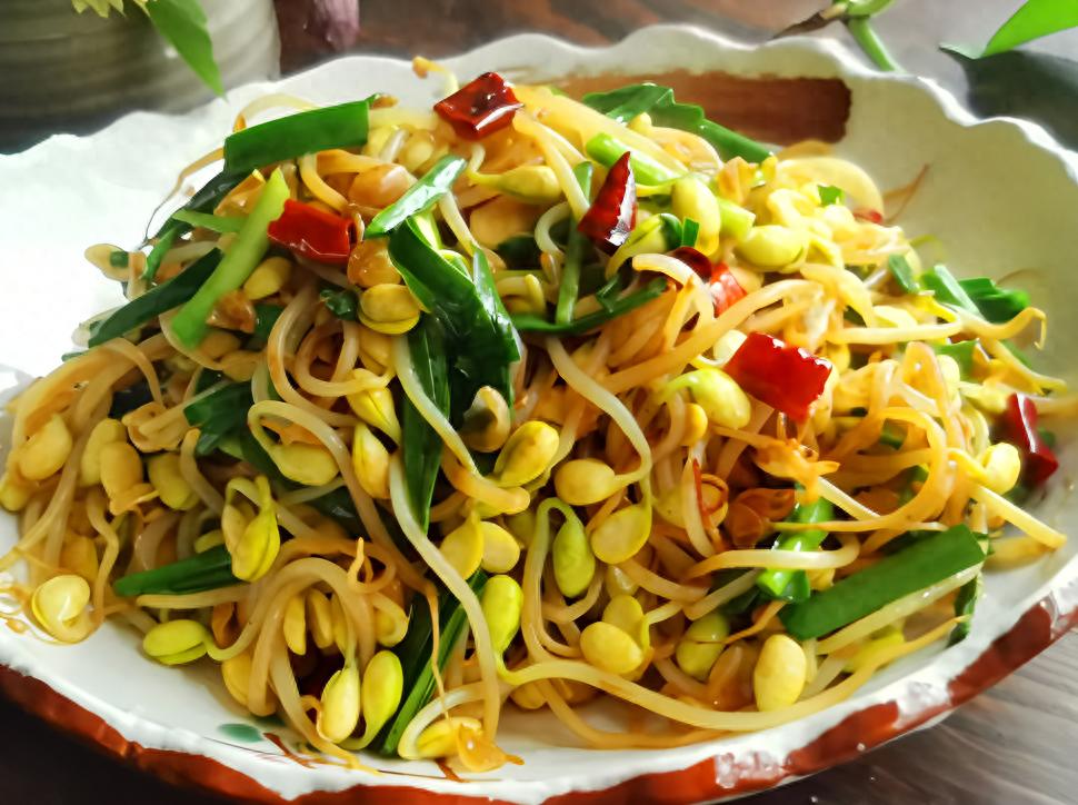 黃豆芽、韭菜、干辣椒、生姜、花椒、鹽、特級生抽、蔥姜料酒