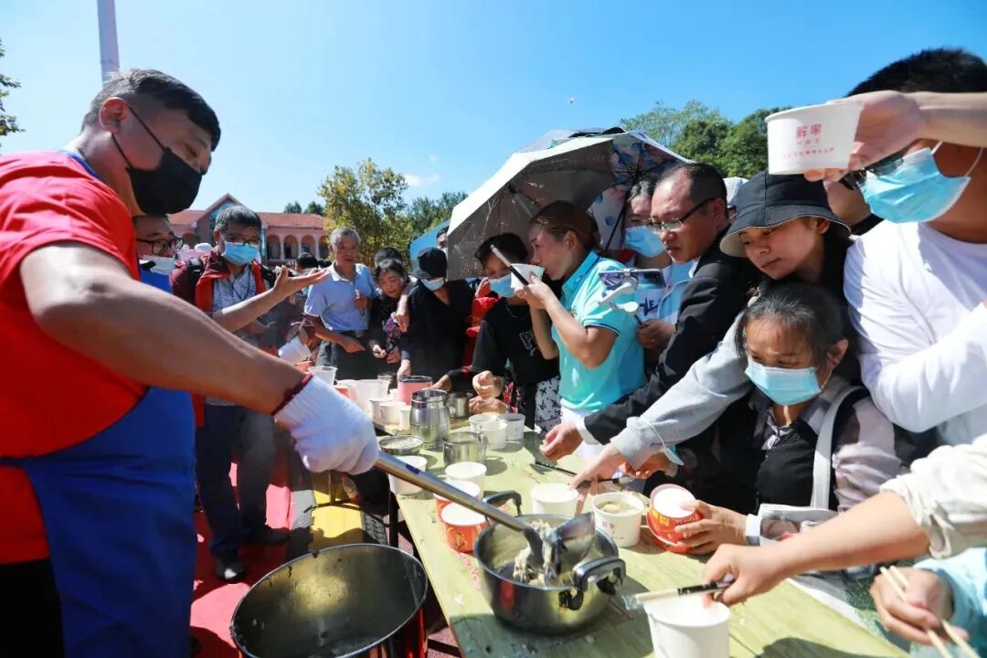 在景區(qū)游客中心廣場(chǎng)的大鍋旁,熱氣蒸騰中站著剛品嘗過(guò)魚(yú)湯的游客。