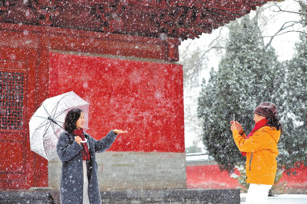 下圖:12月12日,市民在河南省濟源市濟瀆廟賞雪拍照。