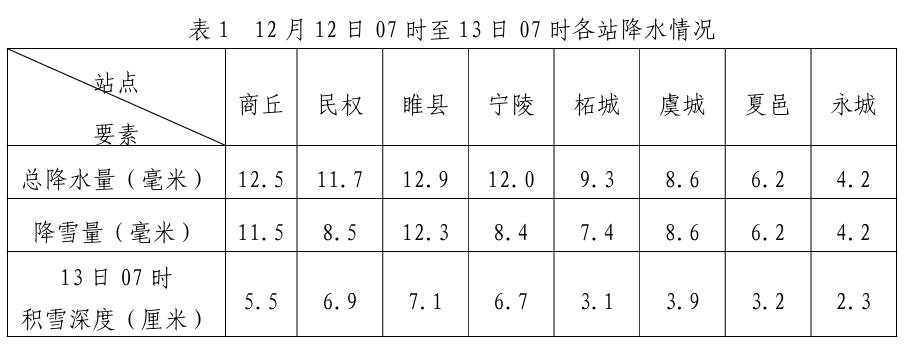 2025年12月12日07時至13日07時:我市出現中到大雪,部分地區暴雪;總降水量4.2毫米(永城)~12.9毫米(睢縣),其中降雪量4.2毫米(永城)~12.3毫米(睢縣);13日07時積雪深度2.3厘米(永城)~7.1厘米(睢縣)。