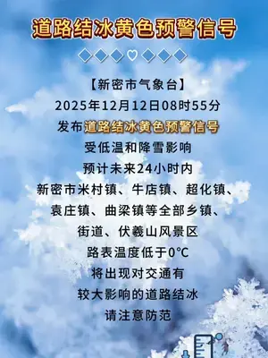 鄭州市氣象臺2025年12月13日8時45分繼續發布道路結冰黃色預警信號: