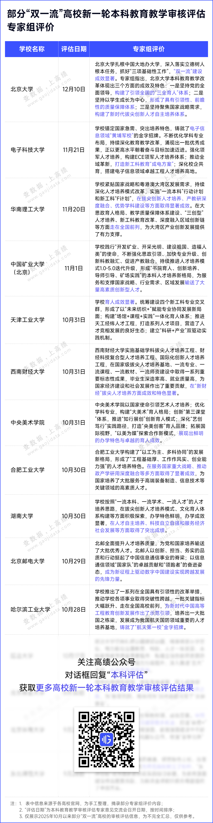 2024-2025年,全國高校陸續(xù)陸續(xù)召開評估啟動(dòng)會(huì)、推進(jìn)會(huì)等,推進(jìn)自評工作。教育部專家組經(jīng)過線上評估+入校評估,召開專家意見交流會(huì)。日前,多所“雙一流”高校先后官宣,完成新一輪本科教育教學(xué)審核評估,并得到了專家組的高度肯定評價(jià)。例如,北京大學(xué)“雙一流”建設(shè)成效顯著,構(gòu)建了新時(shí)代拔尖創(chuàng)新人才自主培養(yǎng)體系;電子科技大學(xué)鑄就了電子信息領(lǐng)域“黃埔軍?!苯鹱终信疲蛟煨鹿た平逃俺呻姺桨浮?/span>;華南理工大學(xué)在在拔尖創(chuàng)新人才培養(yǎng)、產(chǎn)教研深度融合、優(yōu)勢學(xué)科建設(shè)等方面取得顯著成效,多項(xiàng)改革創(chuàng)新走在全國前列;哈爾濱工業(yè)大學(xué)為新時(shí)代中國高等工程教育創(chuàng)新發(fā)展作出了示范引領(lǐng),鑄就了“航天第一?!苯鹱终信频取2糠指咝P乱惠唽徍嗽u估專家組評價(jià)如下: