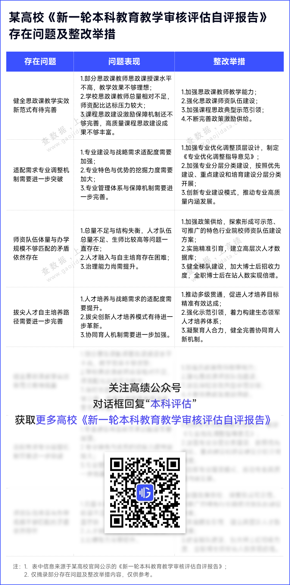 學(xué)校自評是本輪審核評估的重要環(huán)節(jié)。根據(jù)《教育部教育質(zhì)量評估中心開展本科教育教學(xué)審核評估的通知》的要求,高校需在官網(wǎng)公示《新一輪本科教育教學(xué)審核評估自評報(bào)告》,涵蓋學(xué)校簡介、自評工作開展情況、自評結(jié)果等內(nèi)容。其中自評結(jié)果包括了存在問題、原因分析及整改舉措。