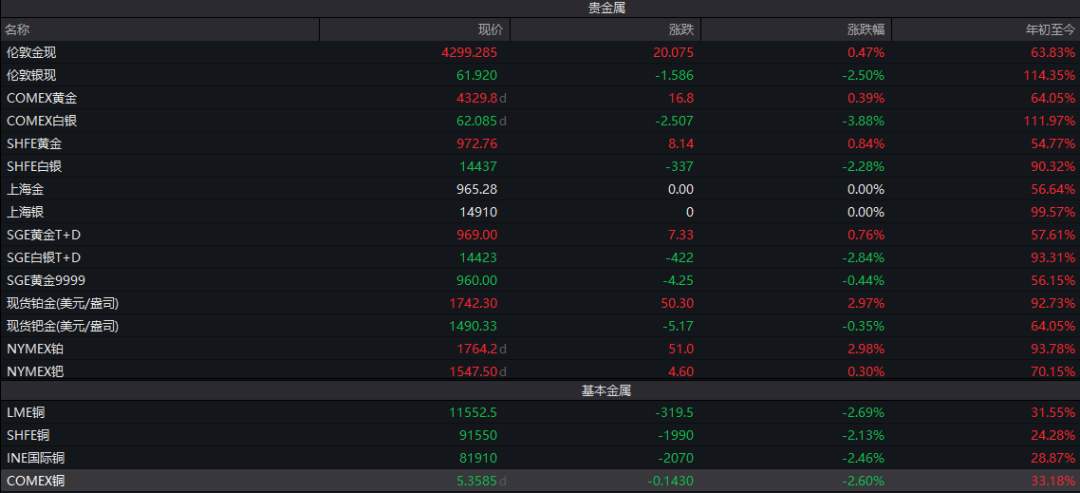 不僅如此,昨晚黃金、白銀、銅等期貨也跳水,COMEX黃金在兩個小時內短線跳水超100美元,最終報收4329.8美元/盎司。COMEX白銀一度大跌5.5%,最終報跌3.88%,LME銅也大跌2.69%。
