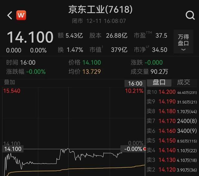 京東工業今日在港交所掛牌,開盤即低于發行價,午間曾回升至14.15港元,最終收報14.1港元,與發行價持平,總市值379億港元。