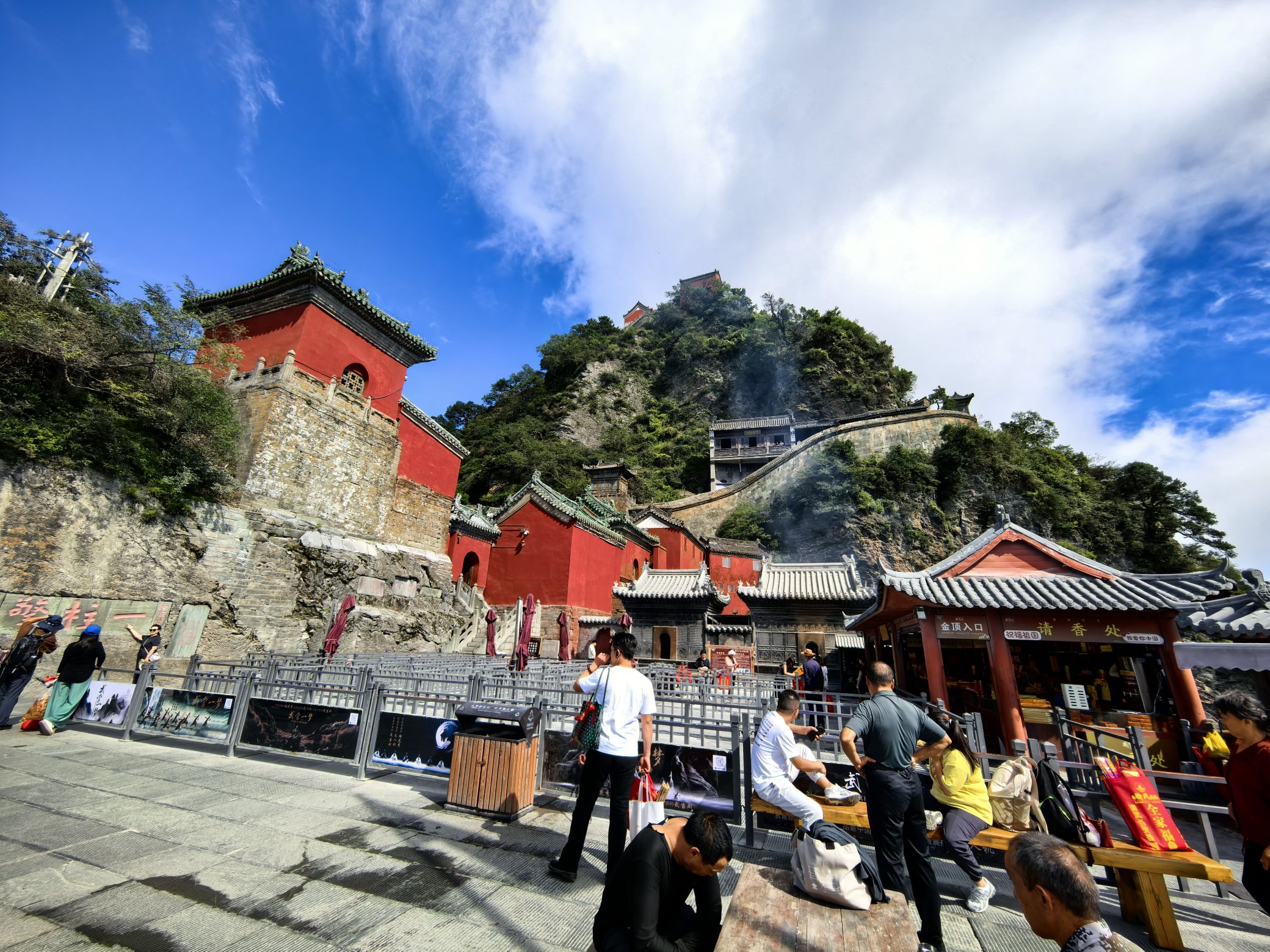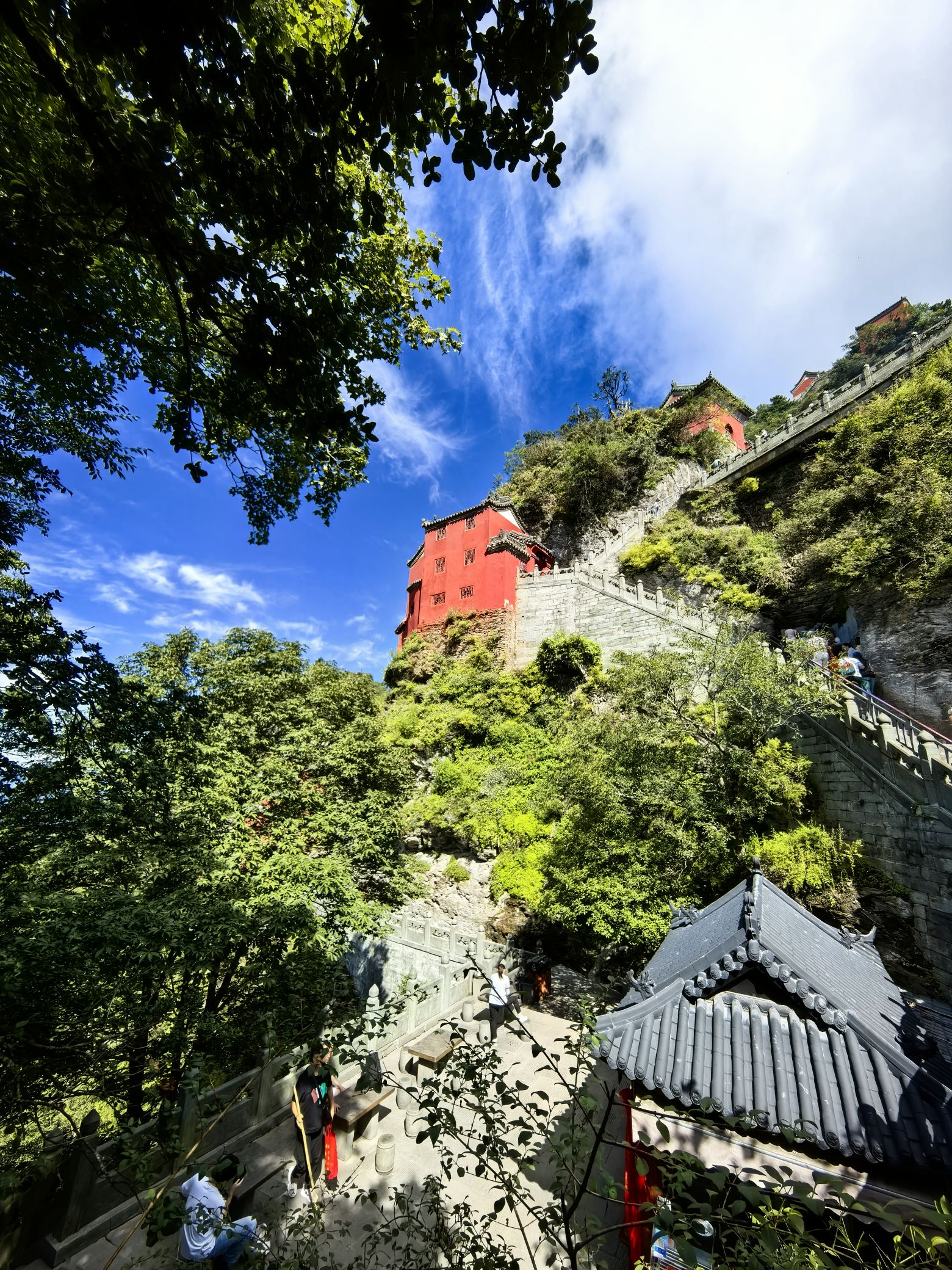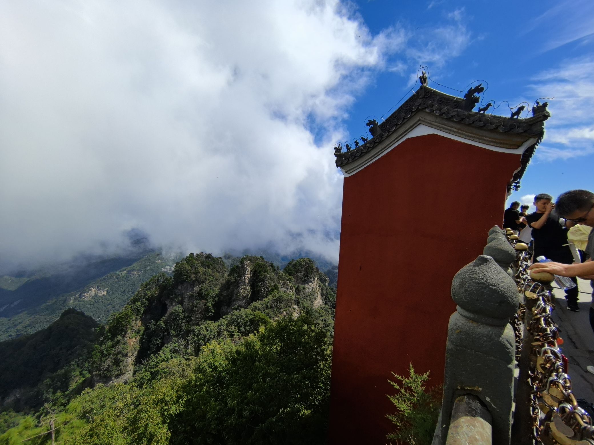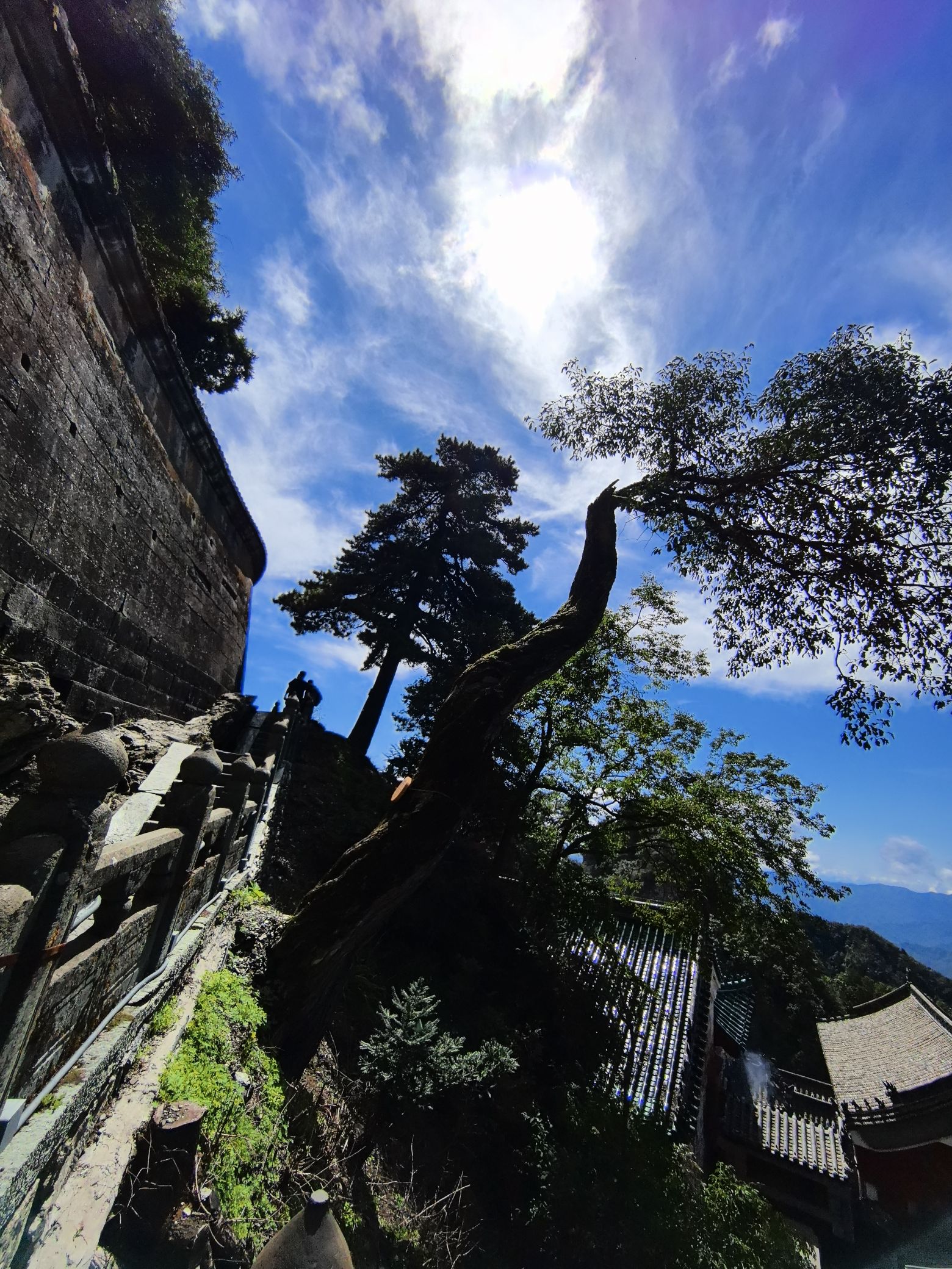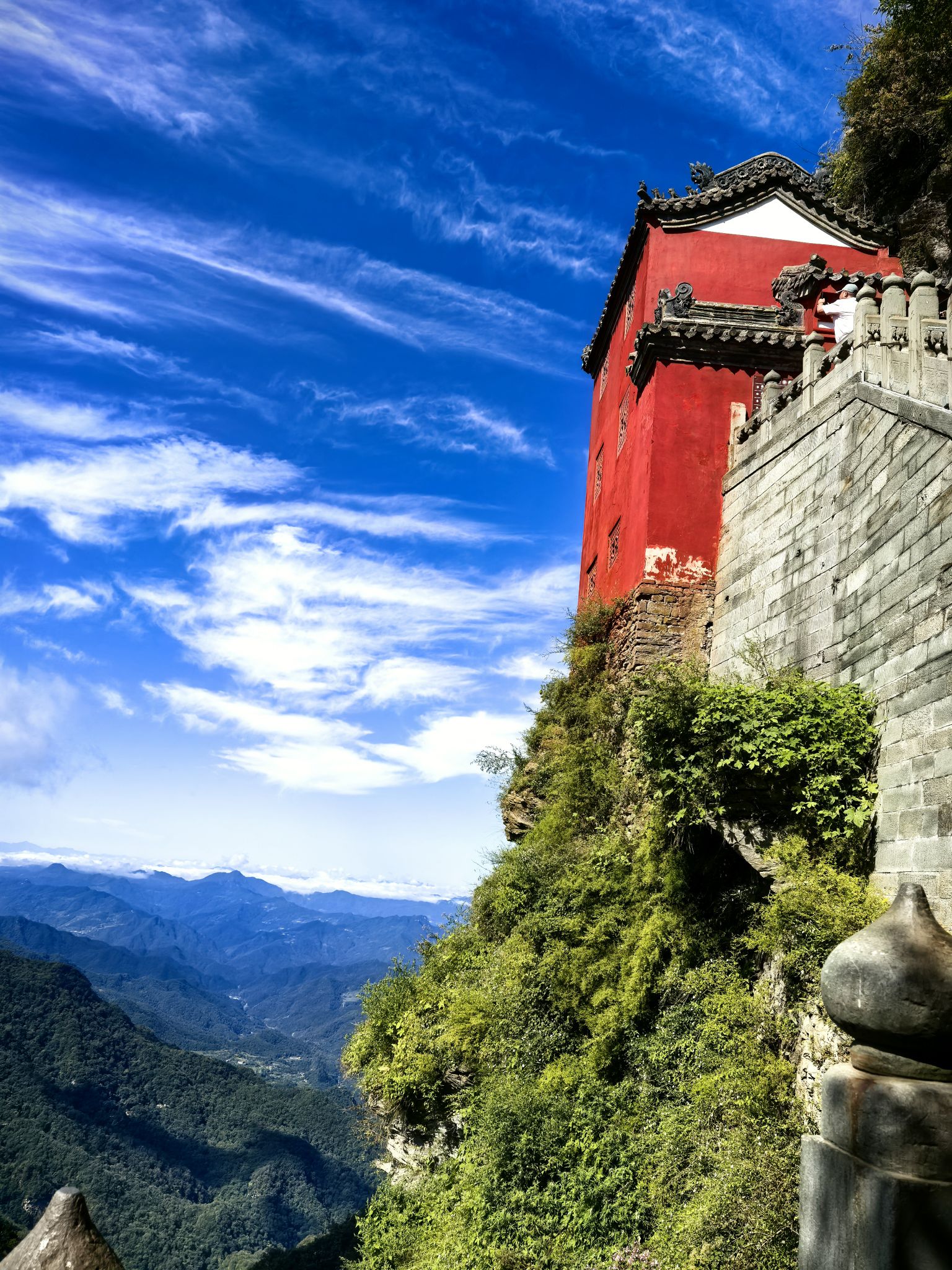 慕名武當山久矣!欲登頂武當山的愿望亦久矣!順道抵達武當山那天,天藍得透徹,浩瀚無垠的凈空,只浮著幾朵棉絮般的云。我們先乘車直達瓊臺中觀,再轉乘索道至觀景平臺,拾階而上十多分鐘,到“一柱擎天”峰絕壁下的紫金城。稍事喘息,又踏上了登頂的石階。石階在崖壁上盤旋而上,游客緩緩向上蛹動。我雙手緊握鐵鏈,手腳並用,每上一步就在鐵鏈上換個位置,艱難攀登。