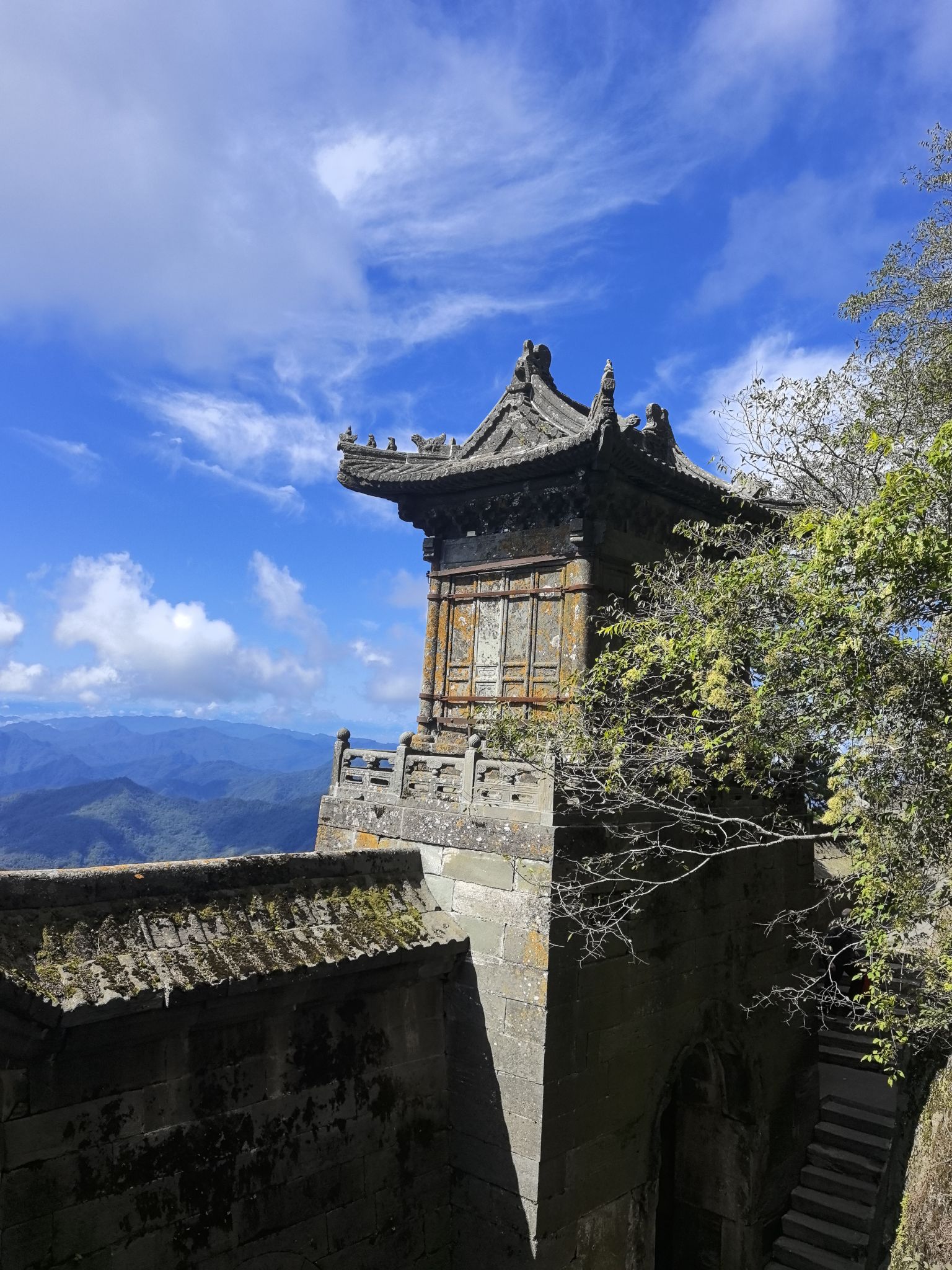 紅日中天,物影稍斜。食欲漸起,下山蹣跚。回首金頂,已在云霧之中若隱若現,恍若仙境。一日登山,雖不能盡悟道家玄理,然身心俱經洗禮,煥然一新。在我的心中,已永遠駐留了一片凌云之境。