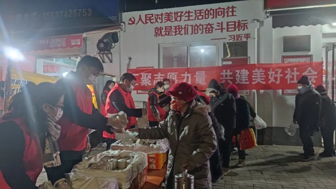 市委社會工作部的志愿者身穿紅色馬甲,與粥屋志愿者一起忙碌。他們分工協作,布置場地、搬運粥桶、擺放餐具與饅頭,現場井然有序。