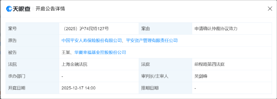 【大河財立方消息】12月10日,天眼查信息顯示,平安人壽及平安資產作為原告起訴華夏幸福基業控股股份公司及“王某”,案由為“申請確認仲裁協議效力”,上訴法院為上海金融法院,開庭日期為12月17日。